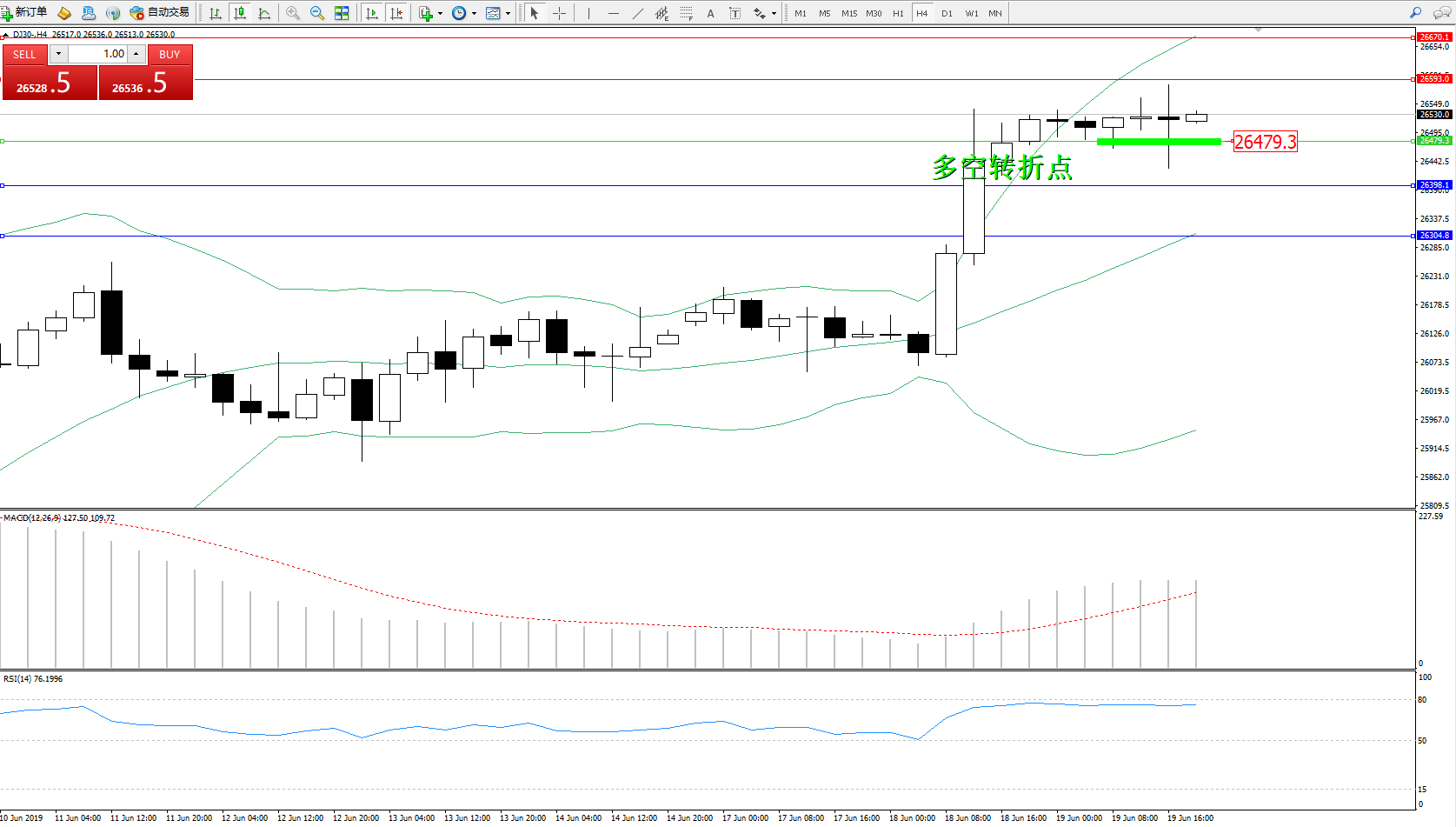 道琼斯指数619日(周三)收盘上涨38.50点,涨幅0.15%,报26504.00点。美联储利率决议维持利率在2.25%-2.5%不变,美联储主席鲍威尔新闻发布会:对政策声明作出重大调整,将采取适当措施维持扩张;点阵图首次发出降息信号,但尚未真正讨论降息规模,今年经济表现合理,GDP增速预期显示增长前景模糊;坚定实现2%的通胀目标,预计回升至2%的步伐放缓;金融市场的风险情绪恶化,制造业、投资和贸易走软。