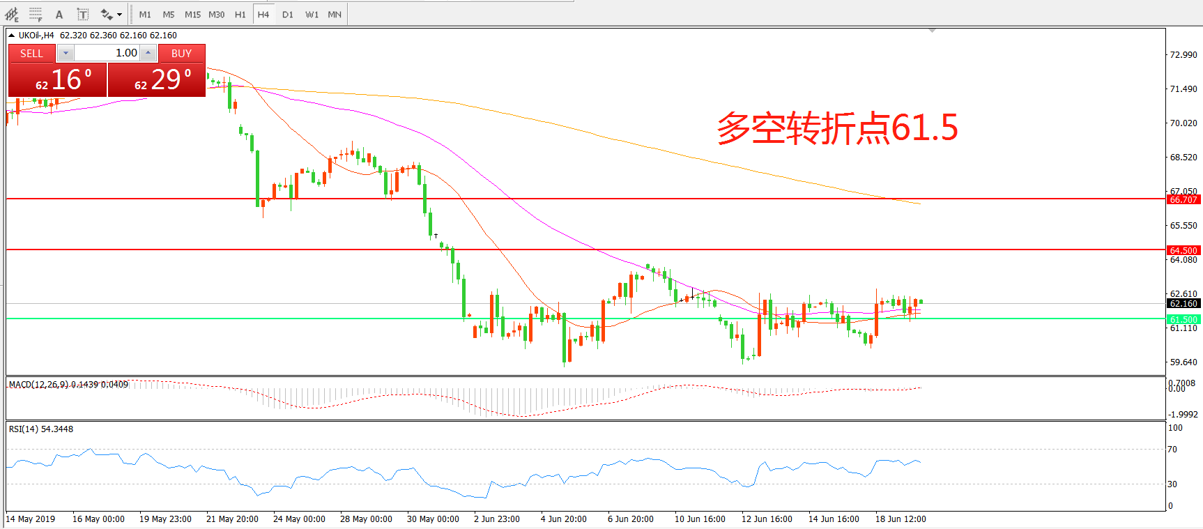 周三(6月19日)美联储宣布维持2.25-2.50%的利率不变,但在决议中内容明显转鸽,放弃了之前的声明中对未来的政策调整保持“耐心”的措辞,还称未来经济前景不确定性增加,消息公布后, 美元指数短线下跌20余点,而美国能源信息署(EIA))公布报告显示,截至6月14日当周,美国原油库存减少310.6万桶至4.824亿桶,降幅创5月10日当周(6周)以来最大,布油震荡反弹,最终收报62.16美元/桶。值得注意的是,石油输出国组织(OPEC)关于下次政策会议举行时间的争论终于告一段落,同意将原定于6月25日-26日举行的政策会议推迟至7月1日-2日。