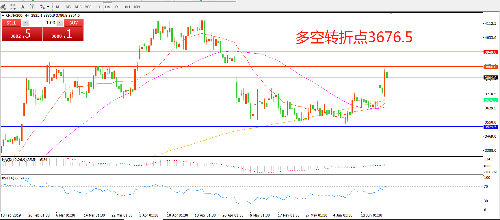 4小时图看,沪深300指数长阳拉升,突破前期整理区间,表现强势,均线系统粘合形成下方支撑,MACD红柱增加,RSI指标拐头向上,日内延续上行概率较大。