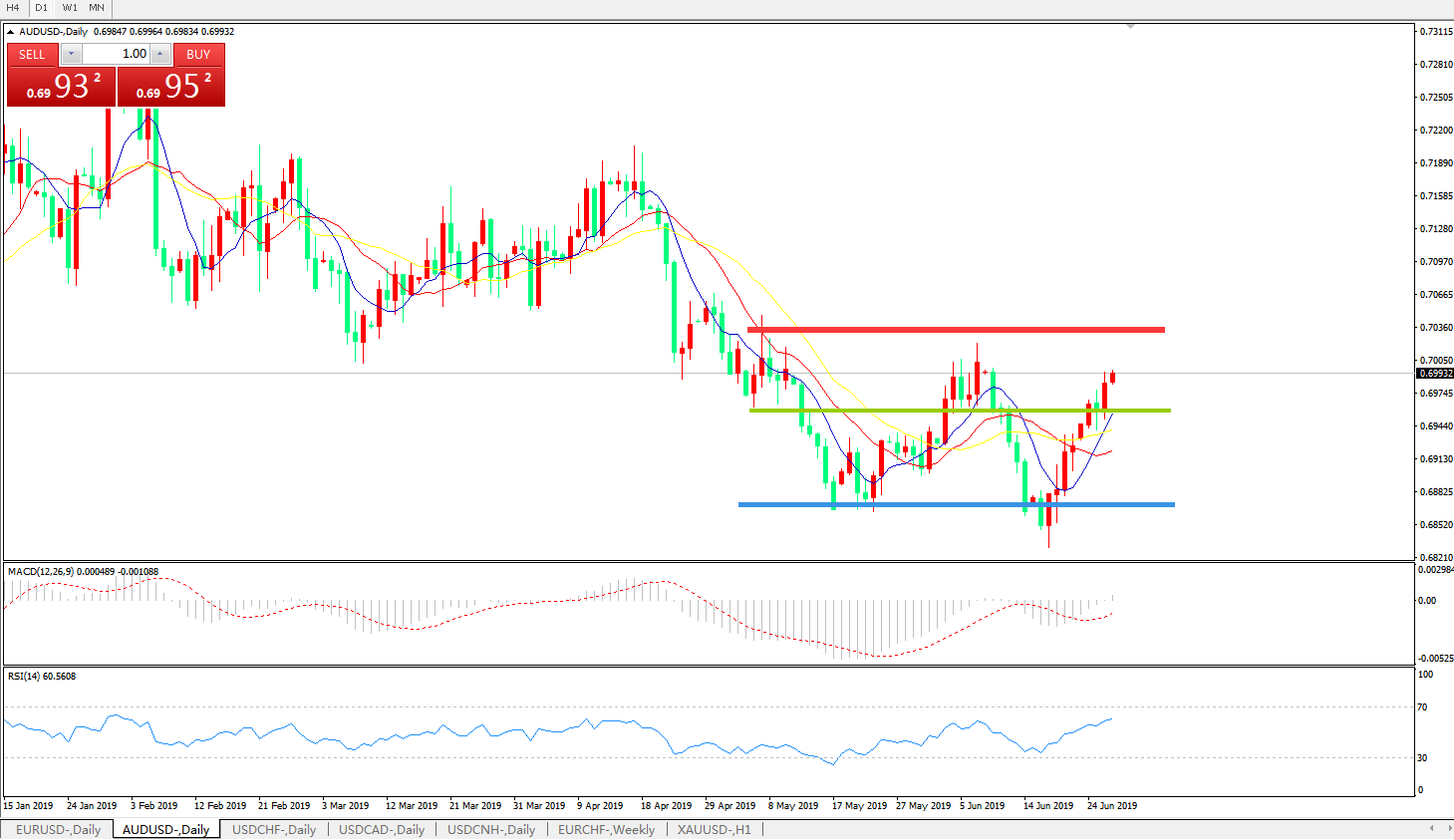 技术面简析:日图均线逐步呈有序多头排列,汇价延续温和上行态势,MACD逐步逼近0轴且动能柱0轴上方有放量迹象,RSI逐步反弹走高,汇价反弹遭遇重要压制,重点关注0.70整数关口争夺。