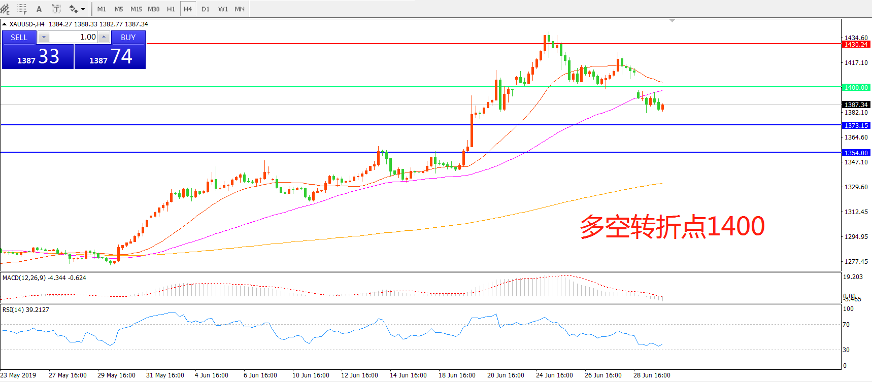 中美双方同意重启贸易谈判,令市场风险情绪大受鼓舞,同时美国最新出炉的ISM制造业指数表现强劲,美元跳升至日内高点,引发金价获利了结,日内收报1387.09美元/盎司。之前受美伊紧张关系的影响,现货黄金上周一度触及六年高位至1438.63美元/盎司,目前已经从这一高位回落约50美元,对趋势交易者来说,这波回调是很好的逢低买入契机。而据周二(7月2日)亚市早盘最新消息报道,美国提出对欧盟40亿美元的商品加征关税,搅动全球市场的特朗普依然是全球市场“风险“的主要来源。