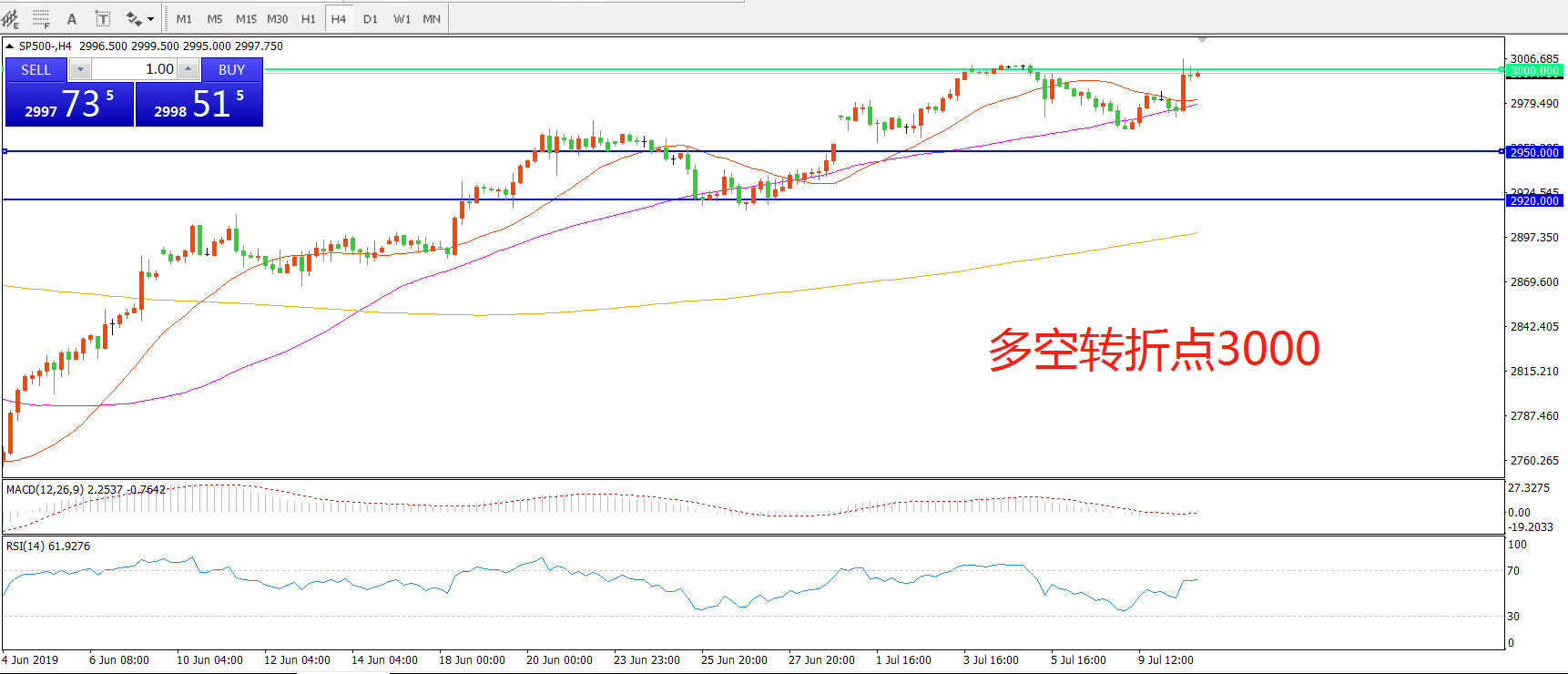 4小时图看,标普站稳2950后震荡上行,昨日回踩均线支撑后长阳拉升,短期走势依然偏强,MACD红柱增加,RSI指标拐头走平,日内延续震荡概率较大。