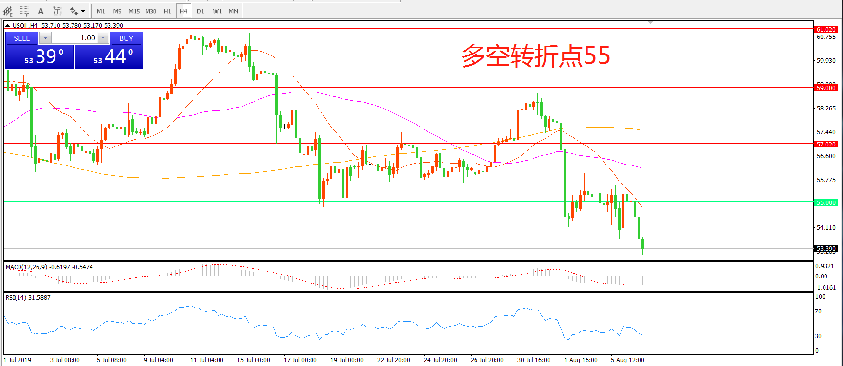 4小时图看,油价跌破55一线支撑后真的下次,整体走势偏向弱势震荡,均线系统呈现空头排列,MACD绿柱增加, RSI指标向下,日内延续下行概率较大。