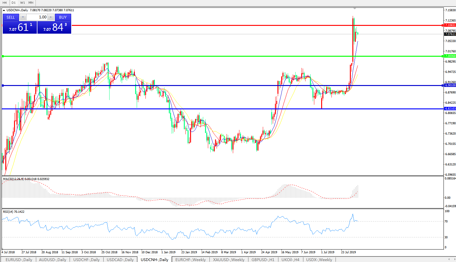 美元兑人民币USDCNH 日线图: