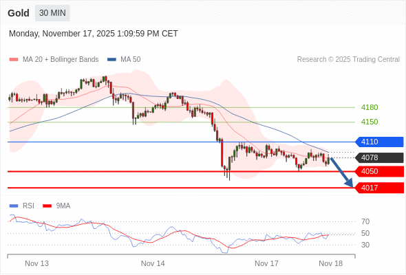 在 4110 之下,看跌,目标价位为 4050 ,然后为 4017 。