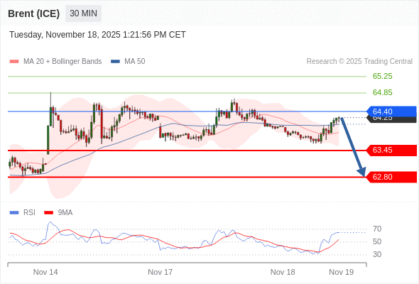 在 64.40 之下,看跌,目标价位为 63.45 ,然后为 62.80 。