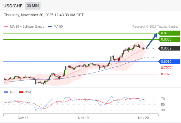 在 0.8010 之上,看涨,目标价位为 0.8080 ,然后为 0.8100 。