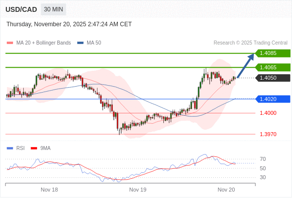 在 1.4020 之上,看涨,目标价位为 1.4065 ,然后为 1.4085 。
