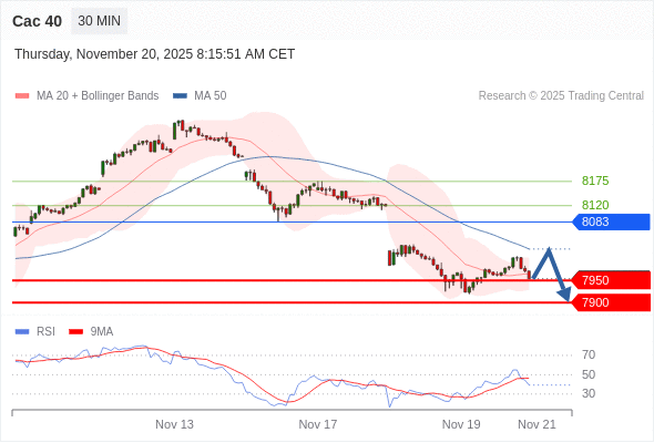 Cac 40 当日内: 短期关键阻力位在8083。