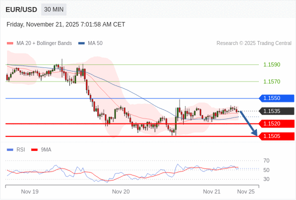 欧元/美元 当日内: 短期关键阻力位在1.1550。