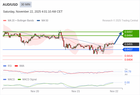 澳元/美元 当日内 : 看涨,当 0.6437 为支撑位。