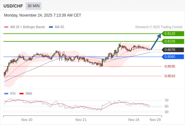 在 0.8060 之上,看涨,目标价位为 0.8100 ,然后为 0.8120 。
