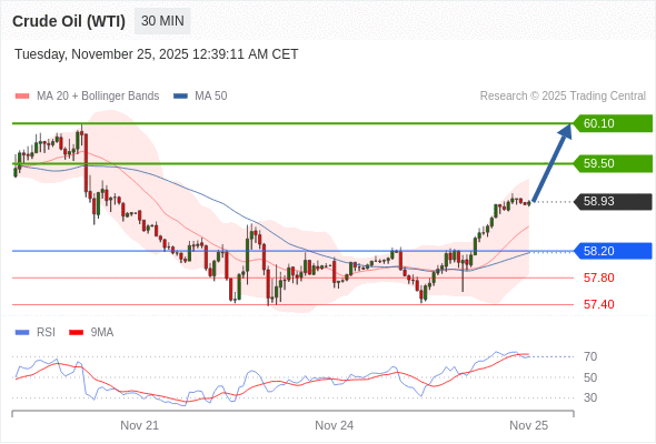 在 58.20 之上,看涨,目标价位为 59.50 ,然后为 60.10 。