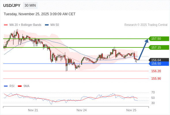 在 156.50 之上,看涨,目标价位为 157.15 ,然后为 157.50 。