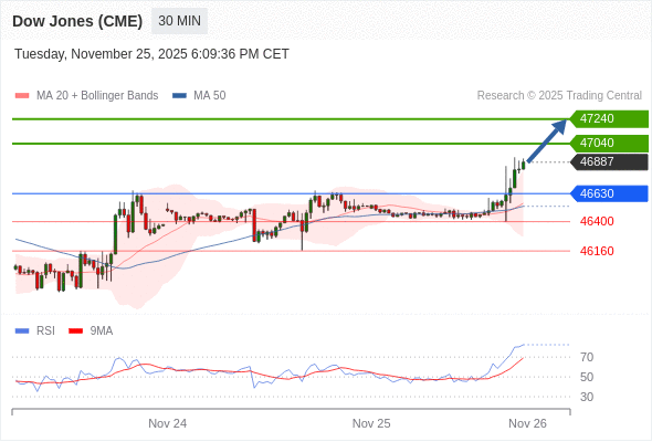 在 46630 之上,看涨,目标价位为 47040 ,然后为 47240 。