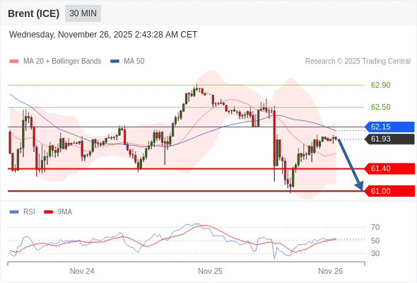 交易策略: 在 62.15 之下,看跌,目标价位为 61.40 ,然后为 61.00 。
