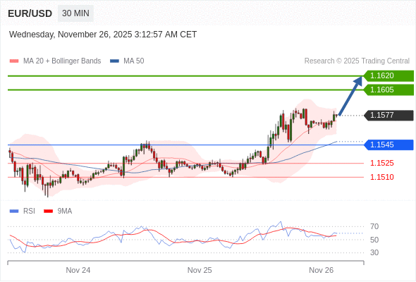 在 1.1545 之上,看涨,目标价位为 1.1605 ,然后为 1.1620 。