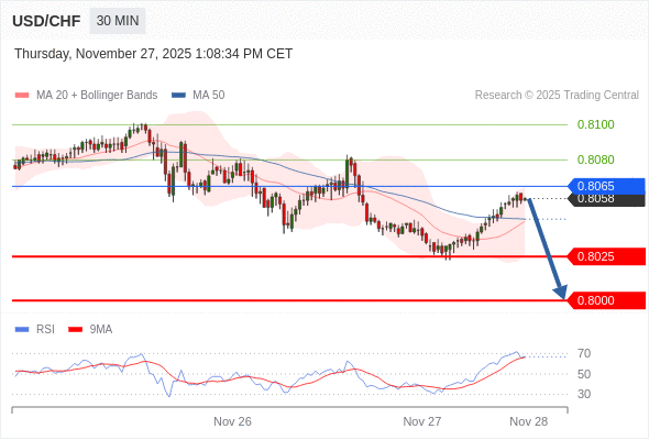 美元/瑞郎 当日内: 短期关键阻力位在0.8065。