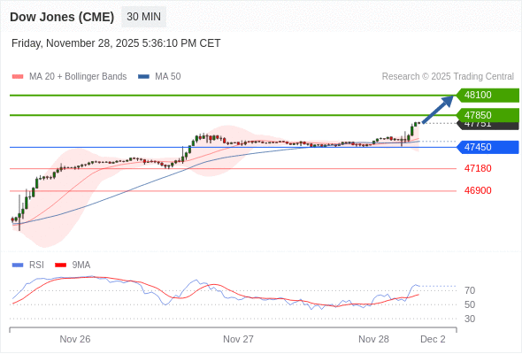 在 47450 之上,看涨,目标价位为 47850 ,然后为 48100 。