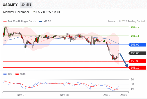 交易策略: 在 156.00 之下,看跌,目标价位为 155.35 ,然后为 155.10 。