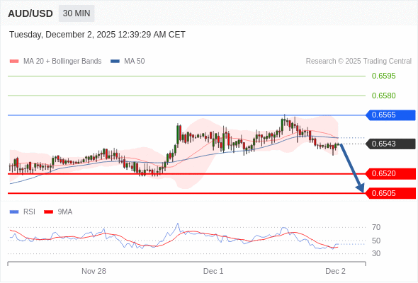 在 0.6565 之下,看跌,目标价位为 0.6520 ,然后为 0.6505 。