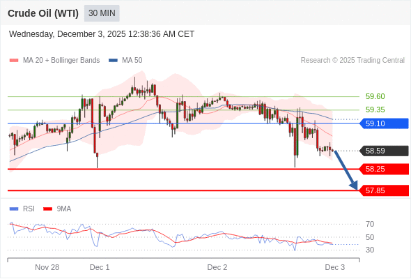 在 59.10 之下,看跌,目标价位为 58.25 ,然后为 57.85 。