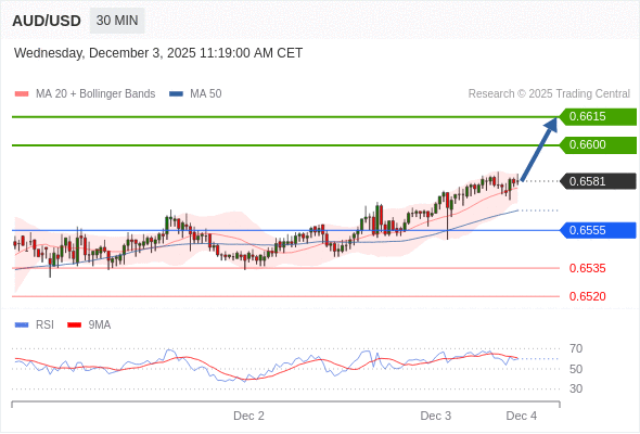 在 0.6555 之上,看涨,目标价位为 0.6600 ,然后为 0.6615 。
