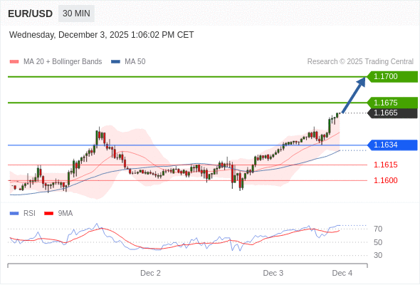 在 1.1634 之上,看涨,目标价位为 1.1675 ,然后为 1.1700 。
