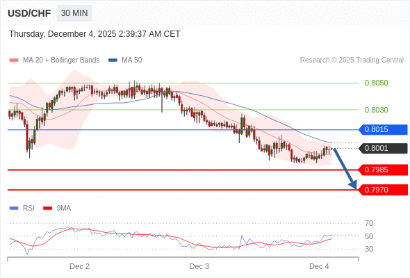 在 0.8015 之下,看跌,目标价位为 0.7985 ,然后为 0.7970 。