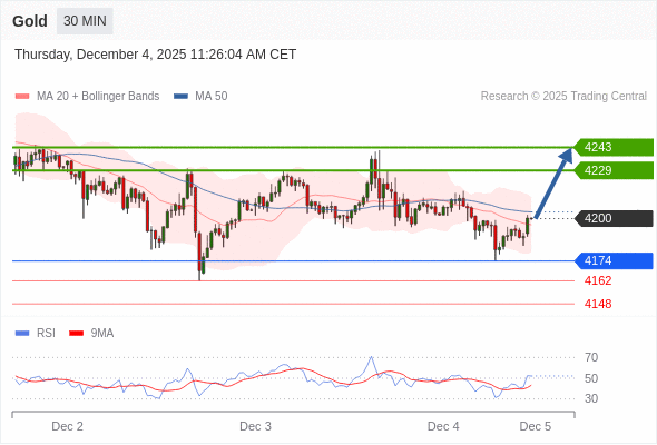 在 4174 之上,看涨,目标价位为 4229 ,然后为 4243 。