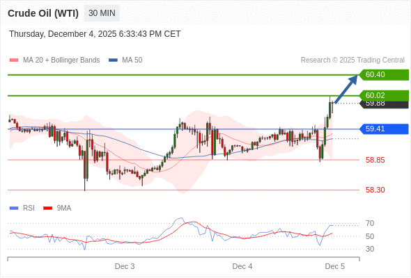 在 59.41 之上,看涨,目标价位为 60.02 ,然后为 60.40 。