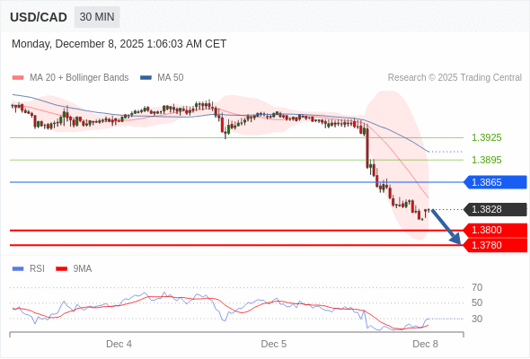 在 1.3865 之下,看跌,目标价位为 1.3800 ,然后为 1.3780 。