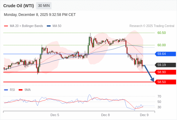 在 59.64 之下,看跌,目标价位为 58.90 ,然后为 58.50 。
