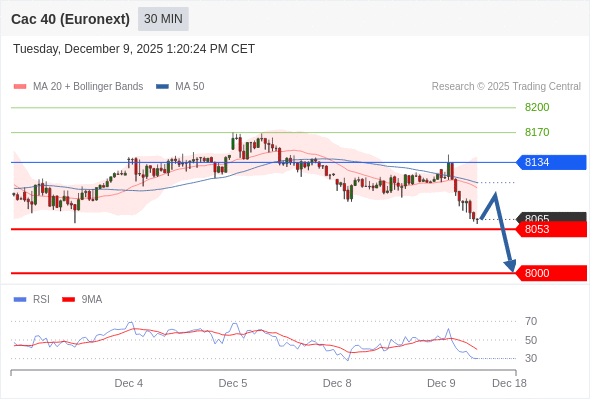 法国CAC指数期货 (Euronext) (Z5) 当日内: 下跌趋势。