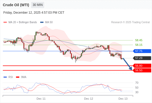 在 57.75 之下,看跌,目标价位为 56.80 ,然后为 56.50 。