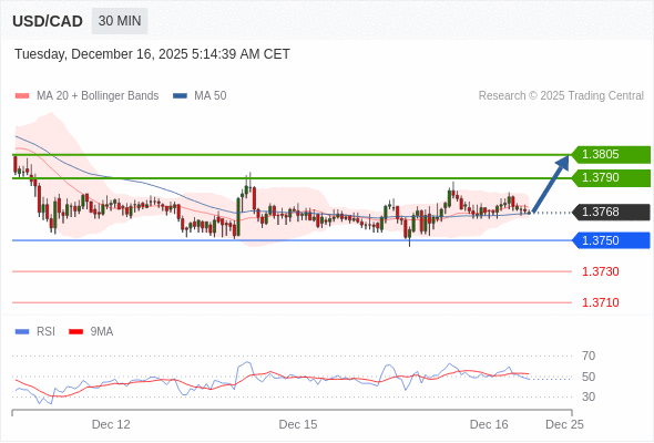 在 1.3750 之上,看涨,目标价位为 1.3790 ,然后为 1.3805 。