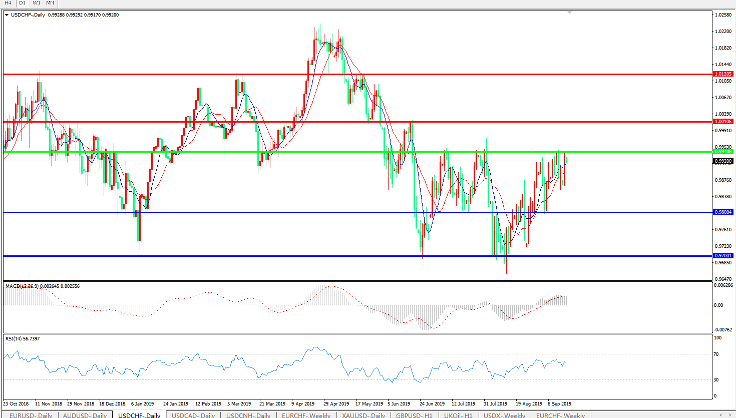美元兑瑞郎在周一日内逐波走高,北美时段开盘前触及0.9920的日高,基本收复了此前因为美元指数在上周五承压而录得的跌幅。虽然周末中东地缘局势再度恶化引发避险情绪升温,但是周一日内欧系货币欧元和英镑承压下跌对瑞郎的连带影响,却盖过了避险买需的拉动。通常而言,出于地缘因素,中东地区的乱局对于欧洲市场的信心打击要高于北美,这直接引发了市场资金的跨大西洋转移。就算是避险货币瑞郎在此过程中也无法独善其身;此外,在上周欧洲央行出台新宽松行动之后,投资者也开始押注瑞士央行本周会议上势必跟随采取行动,这也遏制了瑞郎的上行空间。眼下,美元兑瑞郎将面临关键200日均线切入位0.9950阻力位,能够升破仍需观望此后美联储决议引发的市场联动状况。