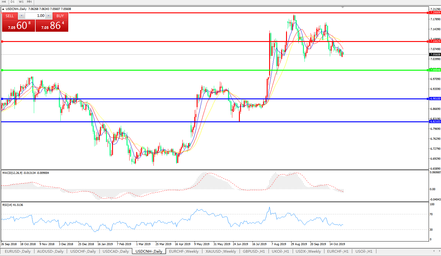 技术面简析:日图短期均线呈空头排列,汇价止跌小幅反弹,MACD下穿0轴且量能0轴下方小幅放量,RSI走低后窄幅整理,预计短期汇价大概率将窄幅整理,汇价持续运行于7.00-7.10区间的概率较大;中美贸易后续谈判进展将决定汇价最终趋势。