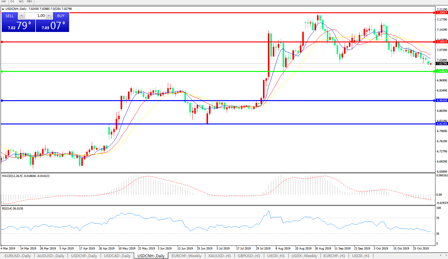 技术面简析:日图短期均线呈空头排列,汇价持续小幅走低,MACD下穿0轴且量能0轴下方小幅放量,RSI持续小幅走低,预计短期汇价大概率将进一步下行,关注7.0整数关口支撑;近期重点关注中美贸易谈判最新进展。
