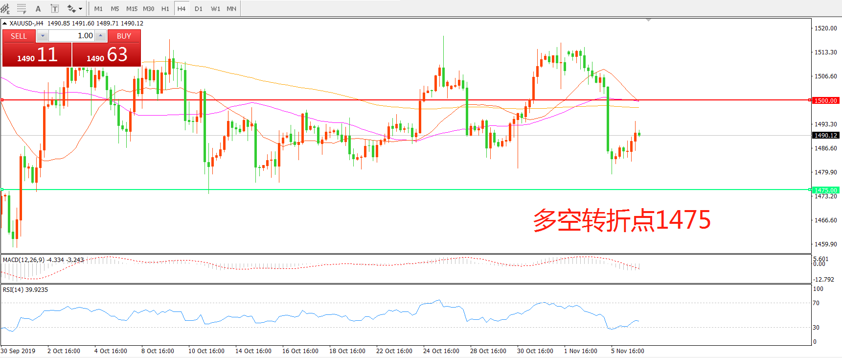 周三(11月6日),经济数据较少,市场交易较为清淡,现货金价维持在1490美元附近窄幅震荡,最终收报1490.12美元/盎司。短期来看,好于预期的经济数据提振美元,打压了市场中的避险情绪,但全球政治经济的不确定性和全球经济放缓的根本问题依然没有得到解决,长期来看,都是支撑金价上行的有利因素,后续中美贸易磋商与美联储政策动向依然是市场关注的焦点。