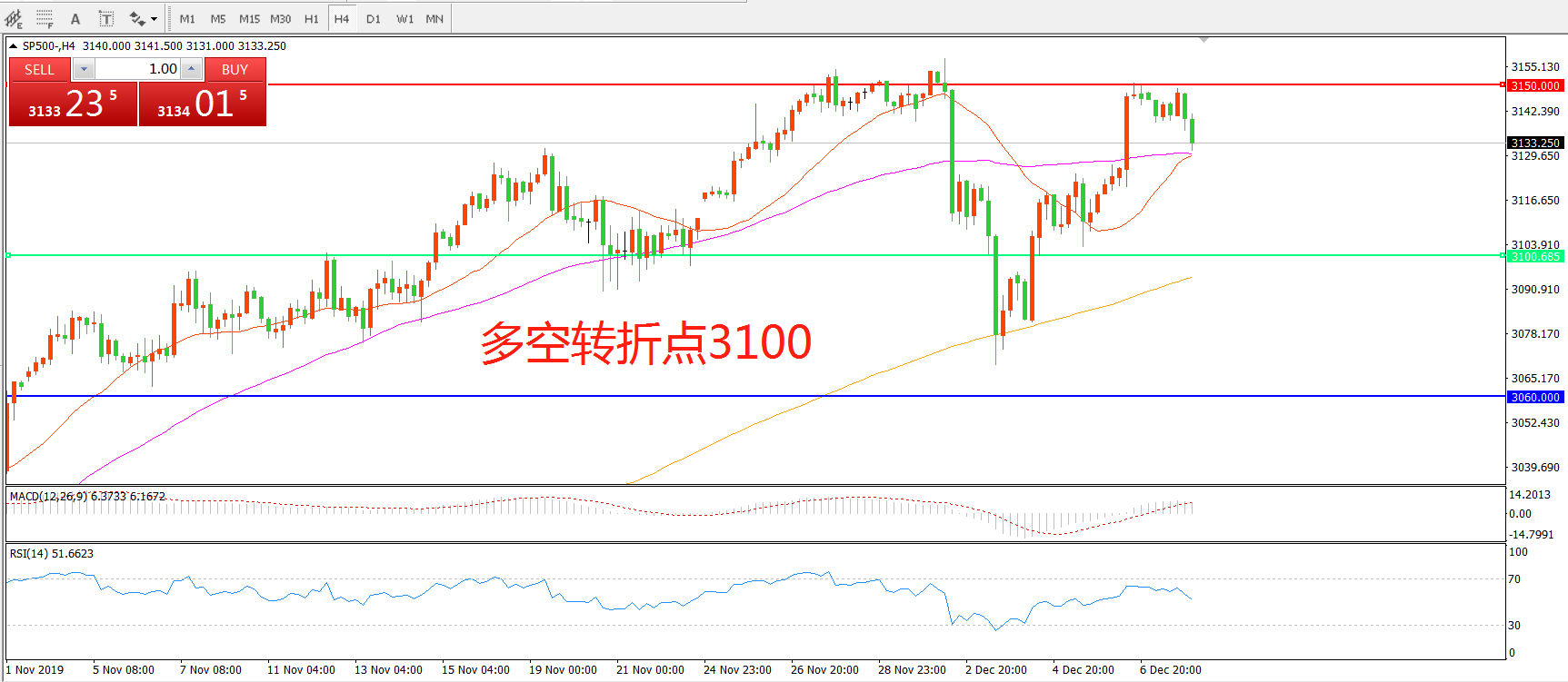 4小时图看,标普以触碰3150阻力再次下行,显示上方阻力较强,但整体走势依然较强,MACD绿柱缩短,红柱增加,RSI指标走平,日内震荡上行概率较大。