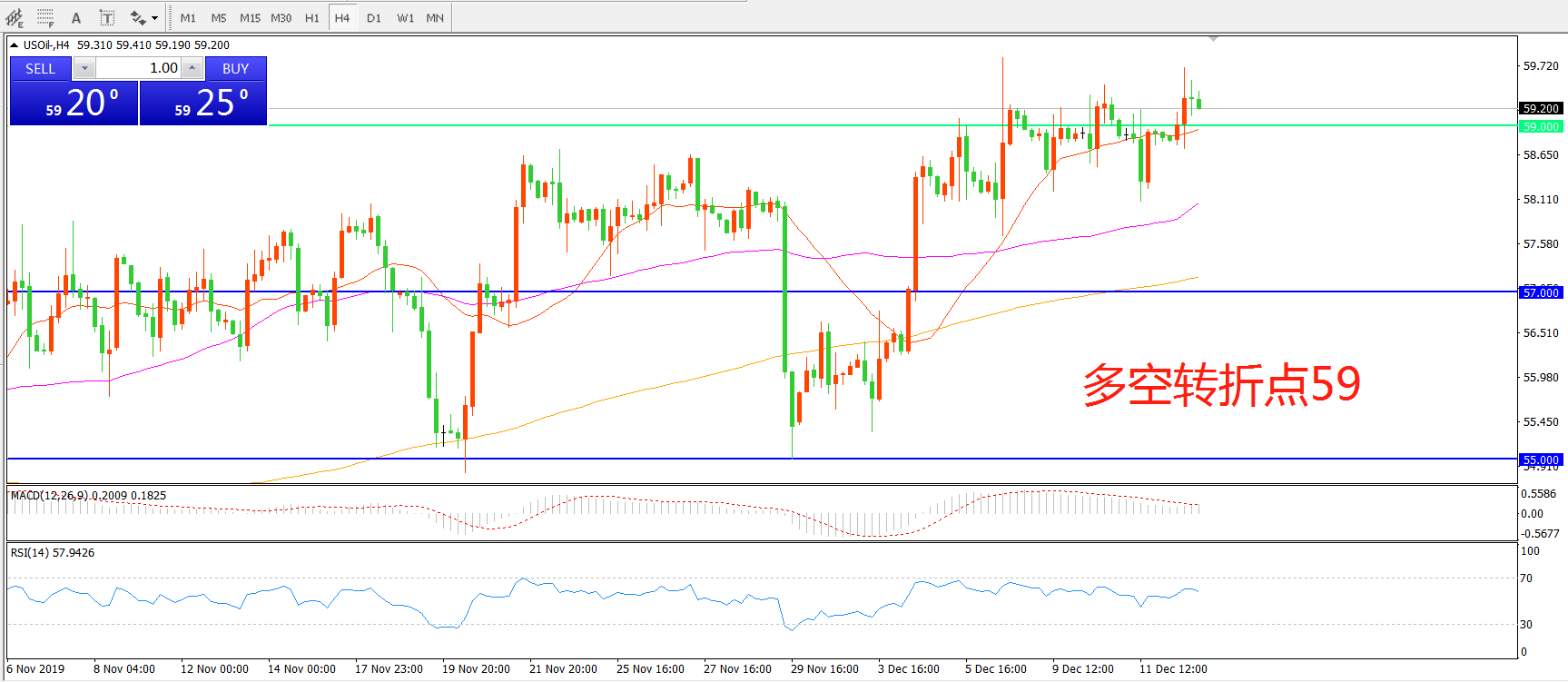 4小时图看,油价延续高位震荡,59美元依然是多空分水岭,均线系统呈多头排列,MACD红柱减少,RSI指标走平,日内延续震荡概率较大。