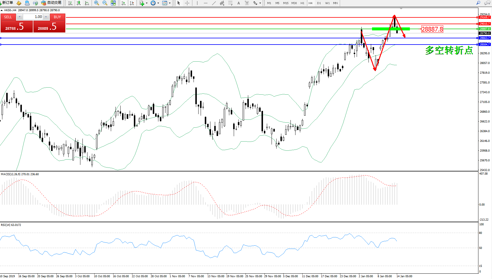 香港恒生指数1月14日(周二)收盘下跌69.80点,跌幅0.24%,报28885.14点;受惠美股造好,恒指早上高开194点,直冲上29000关口,最高29149,沽盘再度涌出,并逐步收窄升幅至倒跌,再失守29000关口。恒指整体表现较为强势,而此前美股的疲软并未对港股造成负面的冲击。在市场避险情势降温、美伊冲突暂缓的背景下,加上市场对中美贸易签署首阶段的贸易协议的预期,均对股市形成了积极的推动作用。投资者风险投资情绪积极,港股上行空间仍存。