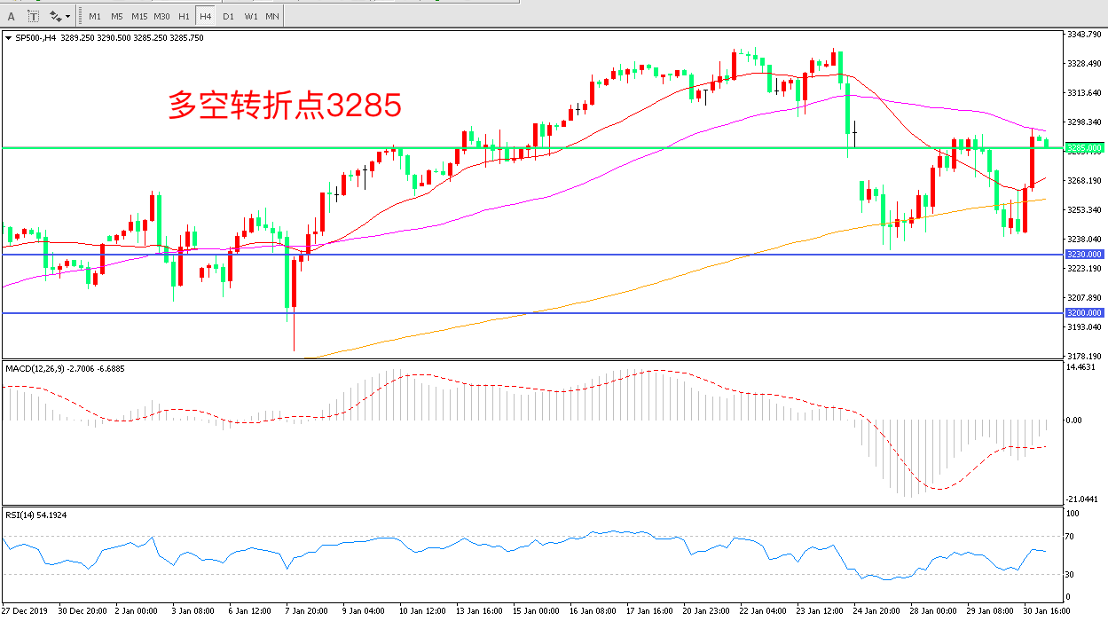 4小时图看,标普500上演V型反转,整体走势有所回暖,均线系统走平,MACD绿柱减少,RSI指标走平,日内延续震荡概率较大。