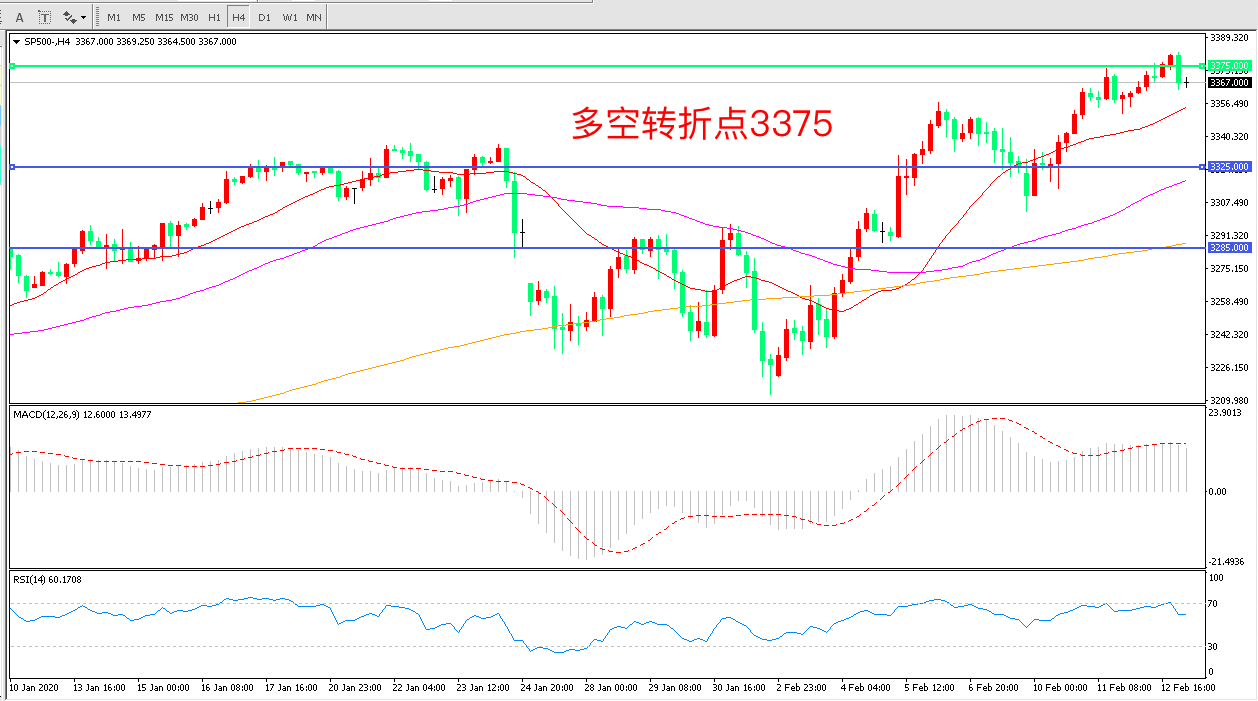 4小时图看,标普连续走高,整体表现强势,均线系统呈多头排列,MACD红柱增加,RSI指标向下,日内震荡上行概率较大。