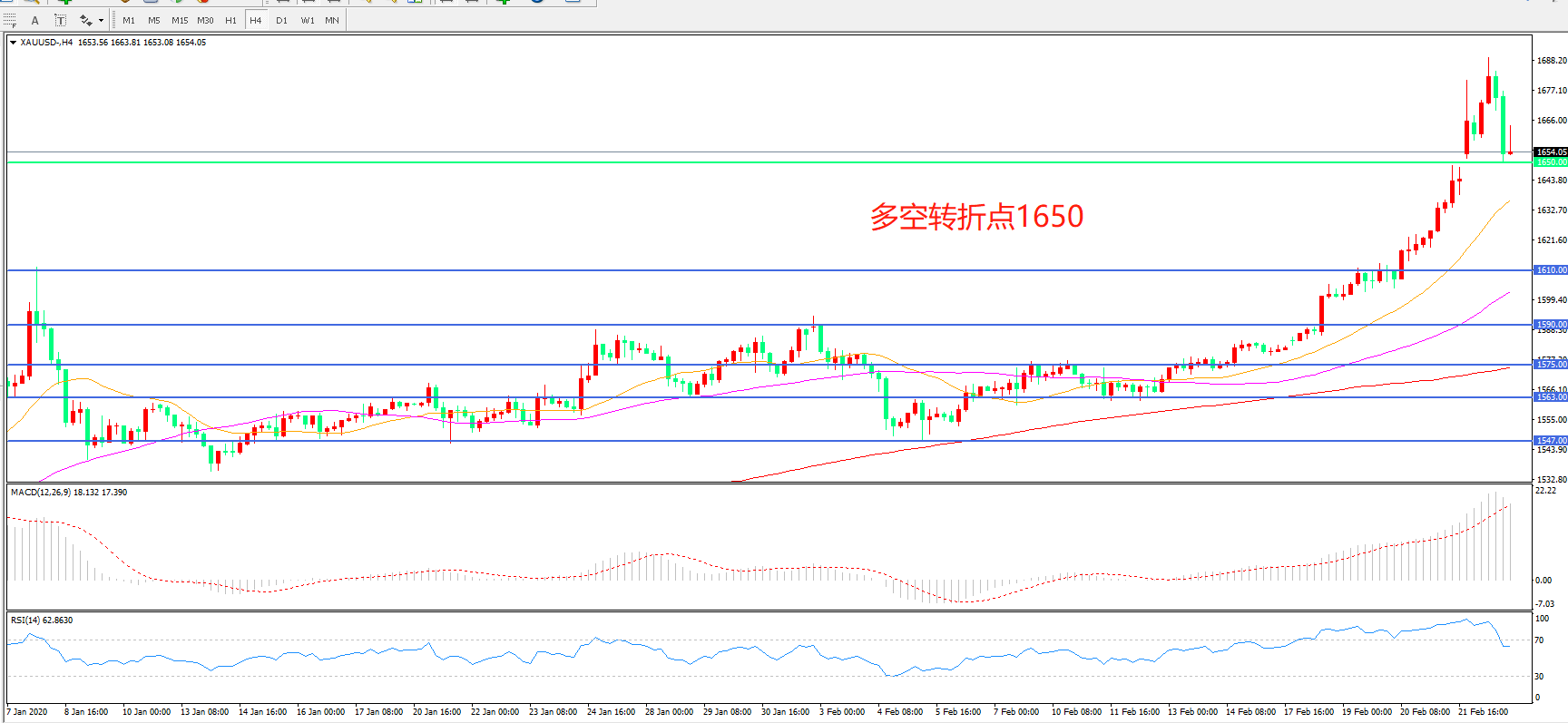 周一(2月24日),国内新冠肺炎疫情的扩散蔓延得到有效控制,但意大利、韩国和伊朗周末均报告确诊病例大幅上升,令市场陷入恐慌,海外金融市场的避险情绪随之升温,大量资金涌向避险资产,现货黄金一度飙升至1689.31美元/盎司,随后震荡回落,收报1654.15美元/盎司。