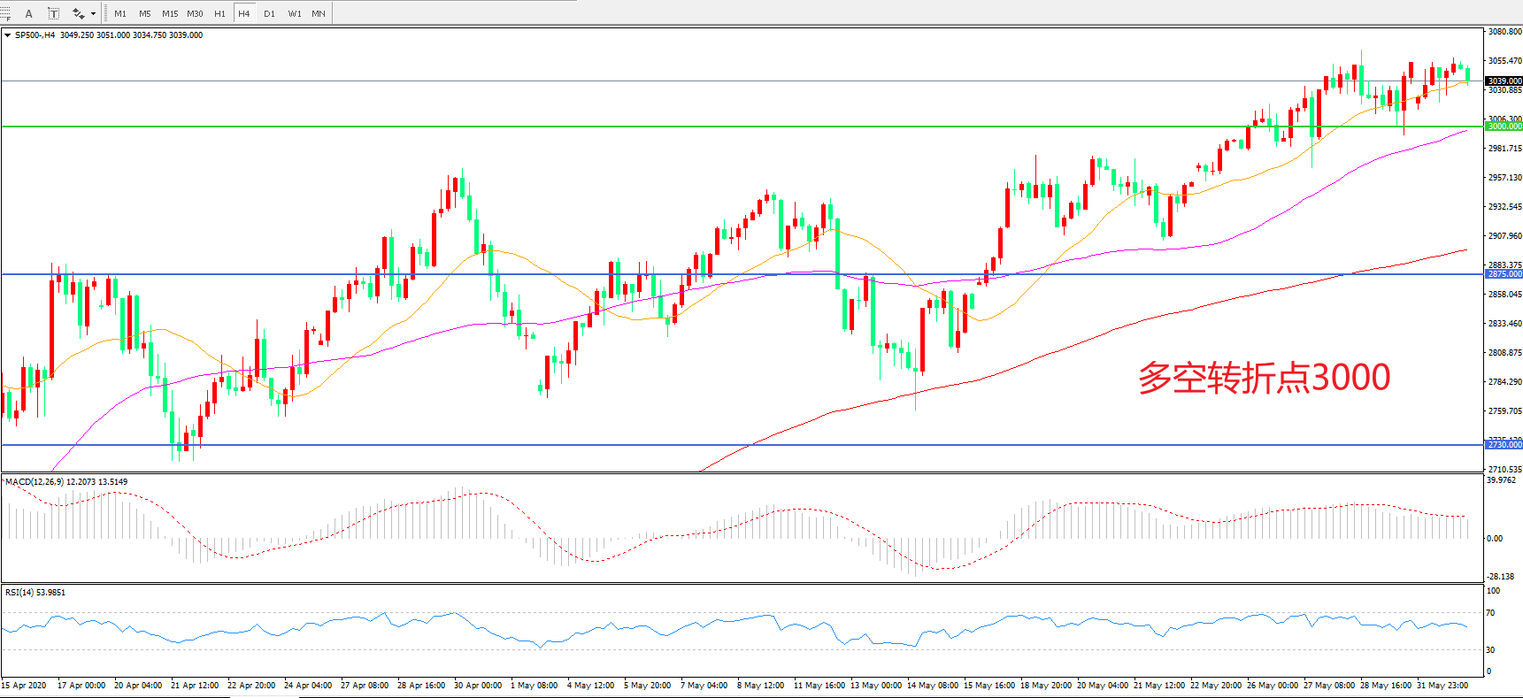周一(6月1日),虽然大国关系紧张,美国爆发大范围示威,新冠肺炎药物测试疗效逊色打压了市场情绪,但欧美等地的数据出现了经济复苏和疫情缓和的新迹象,在汽车、旅游、航空、银行等复工利好股力挺下,标普500震荡上行,收报3042.50点。