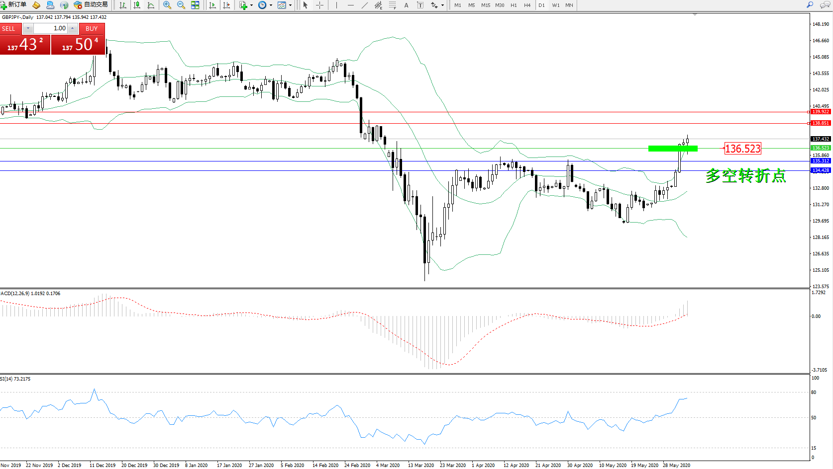 英镑兑日圆上涨至137.510美元附近徘徊,六月底大限将至,英国和欧盟的谈判依然没有突破。英国和欧盟的谈判人员本周进展甚微,双方关于未来贸易协定的谈判仍陷于停顿。据知情人士透露,作为6月关键期限之前的最后一轮谈判,双方在关键问题上仍然相距甚远,紧张气氛并没有显著改善。此轮谈判将于周五正式结束,双方若未能缩小分歧,将增加英国首相约翰逊和欧盟委员会主席冯德莱恩的压力,迫使他们本月晚些时候会晤时直接干预以打破僵局。
