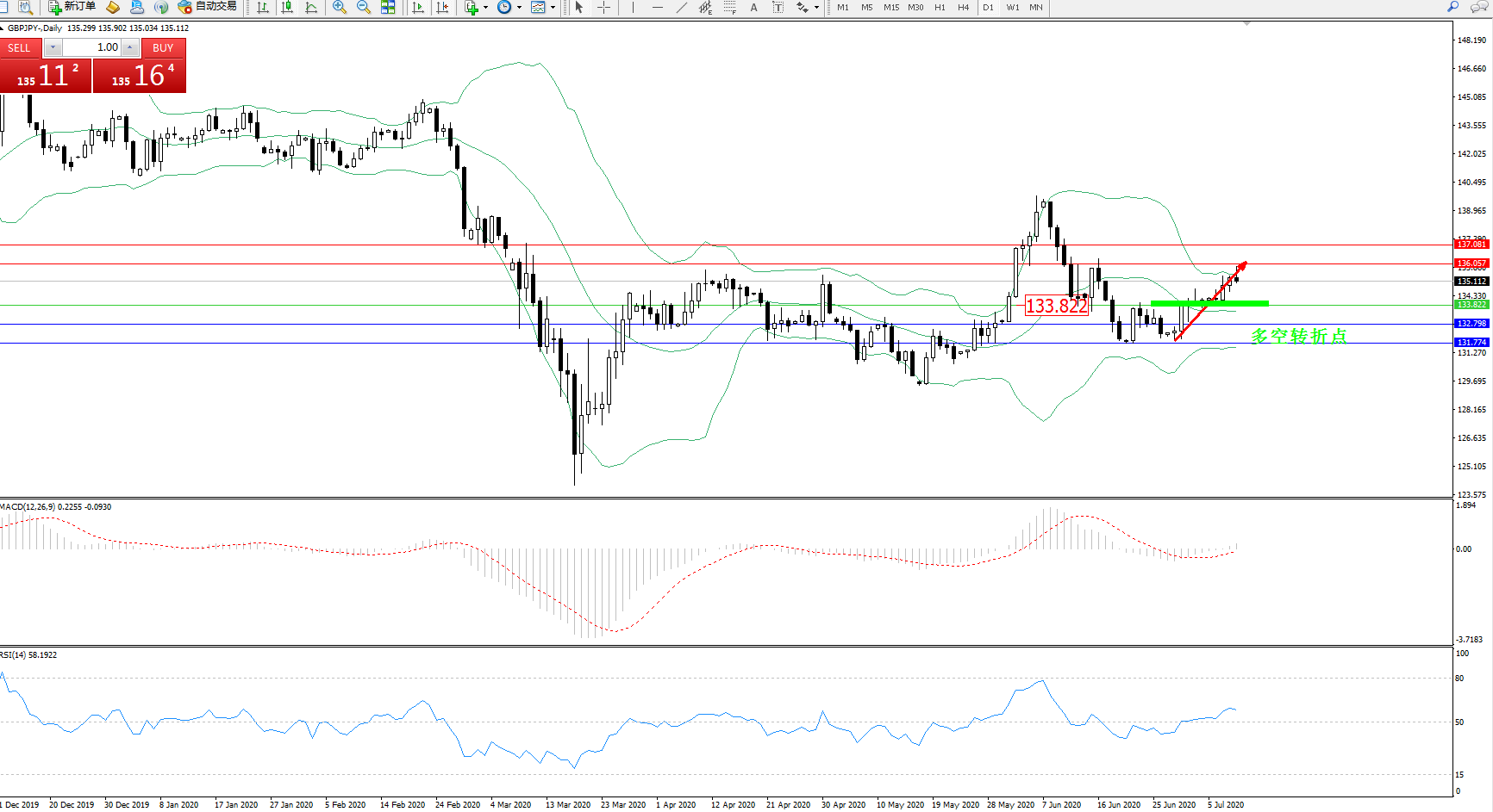 交易策略:133.822上方看涨,目标136.057137.081