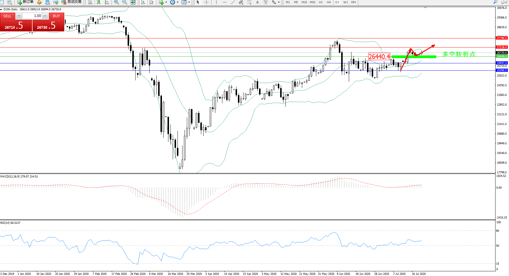 技术点评:长时间纠结于布林带指标通道内持续窄幅震荡走势中,多次试探上轨附近节点后,终究多头动力破位上扬,但后续动力略显不足,突破布林带指标上轨附近关键节点后有回撤迹象,关注26440附近转折点,布林带指标呈收口走势后有张口态势,关注上方转折点,MACD指标长时间纠结于0轴线附近弱势徘徊有上扬迹象,RSI指标处于50均衡线上方维持窄幅整理有开始有拉升上移走势;